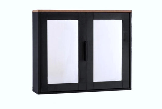 Black Metal Frame Bathroom Mirror with Wooden Shelf
