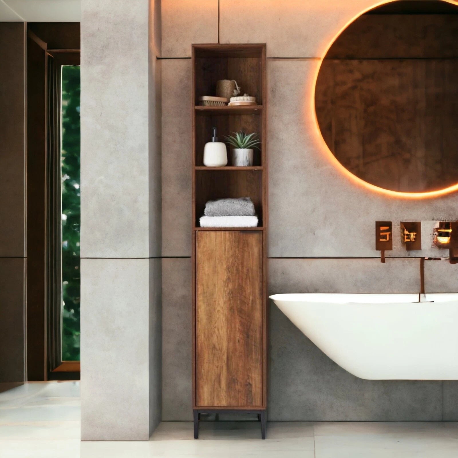 With a sleek vertical design and rustic oak finish, this tallboy is perfect for maximising storage in smaller spaces. It features 1 door and 3 spacious shelves to help organise all your bathroom essentials – from towels and toiletries to cleaning supplies.