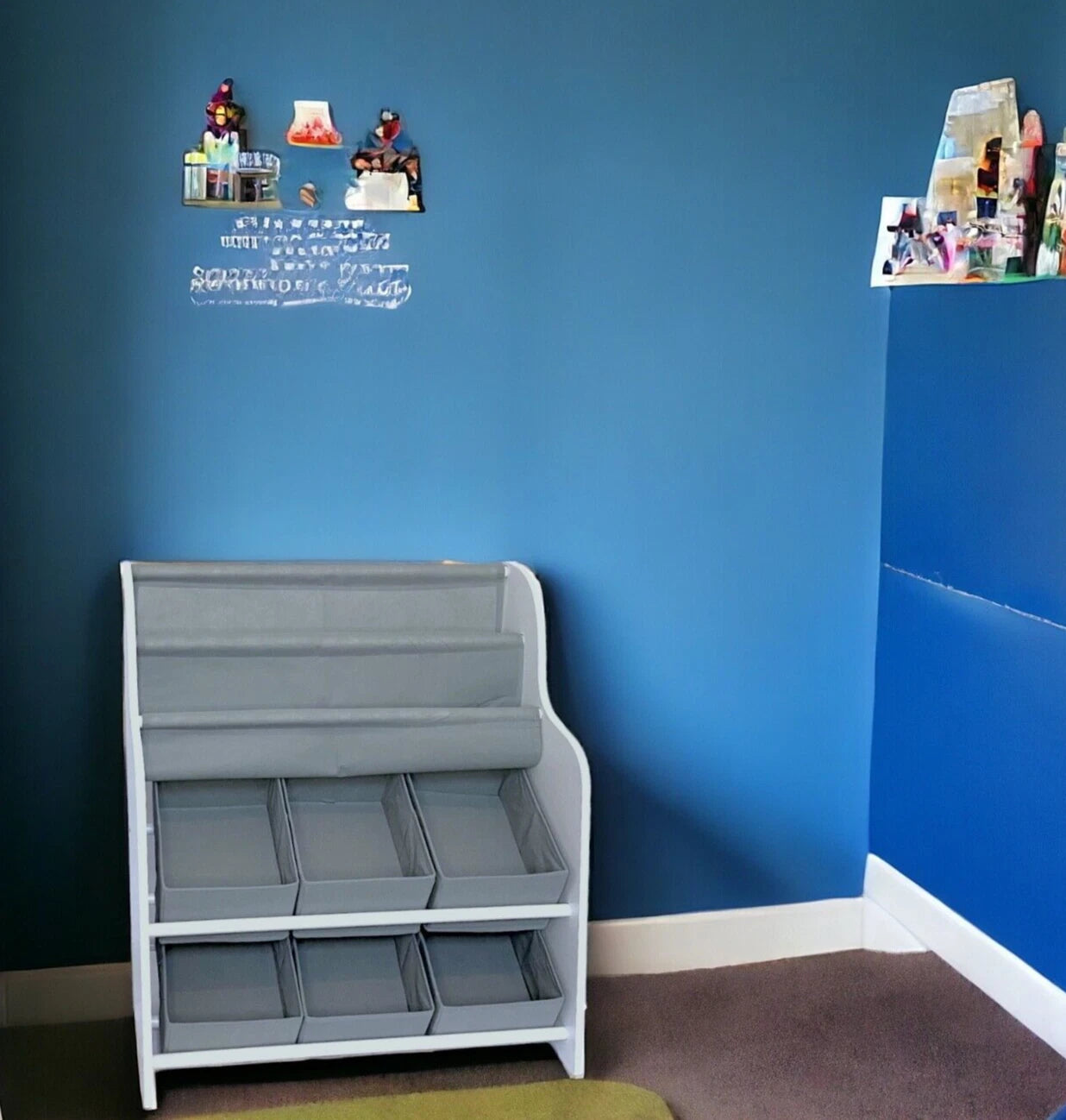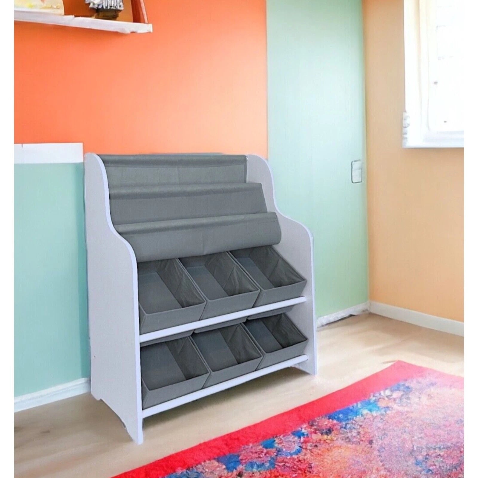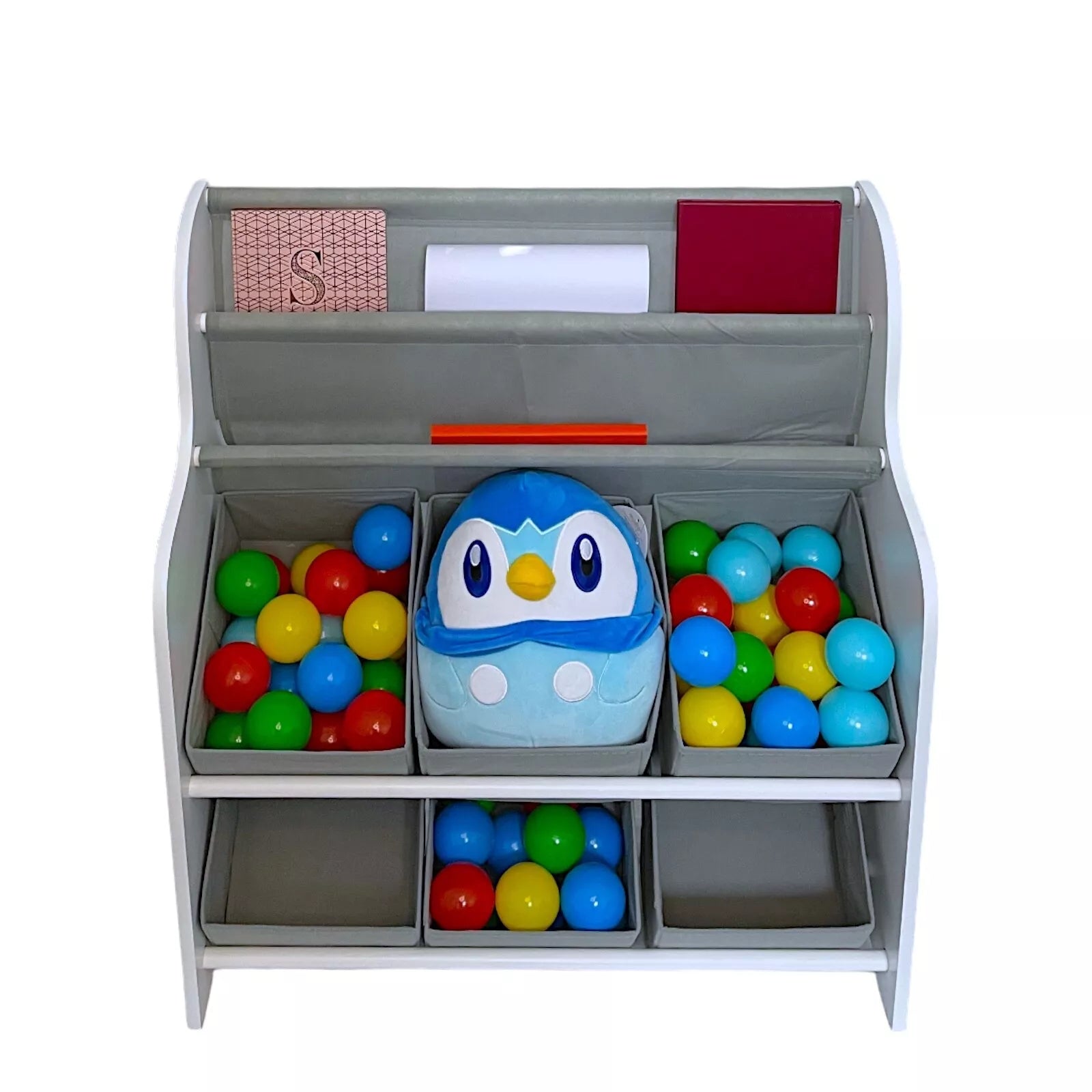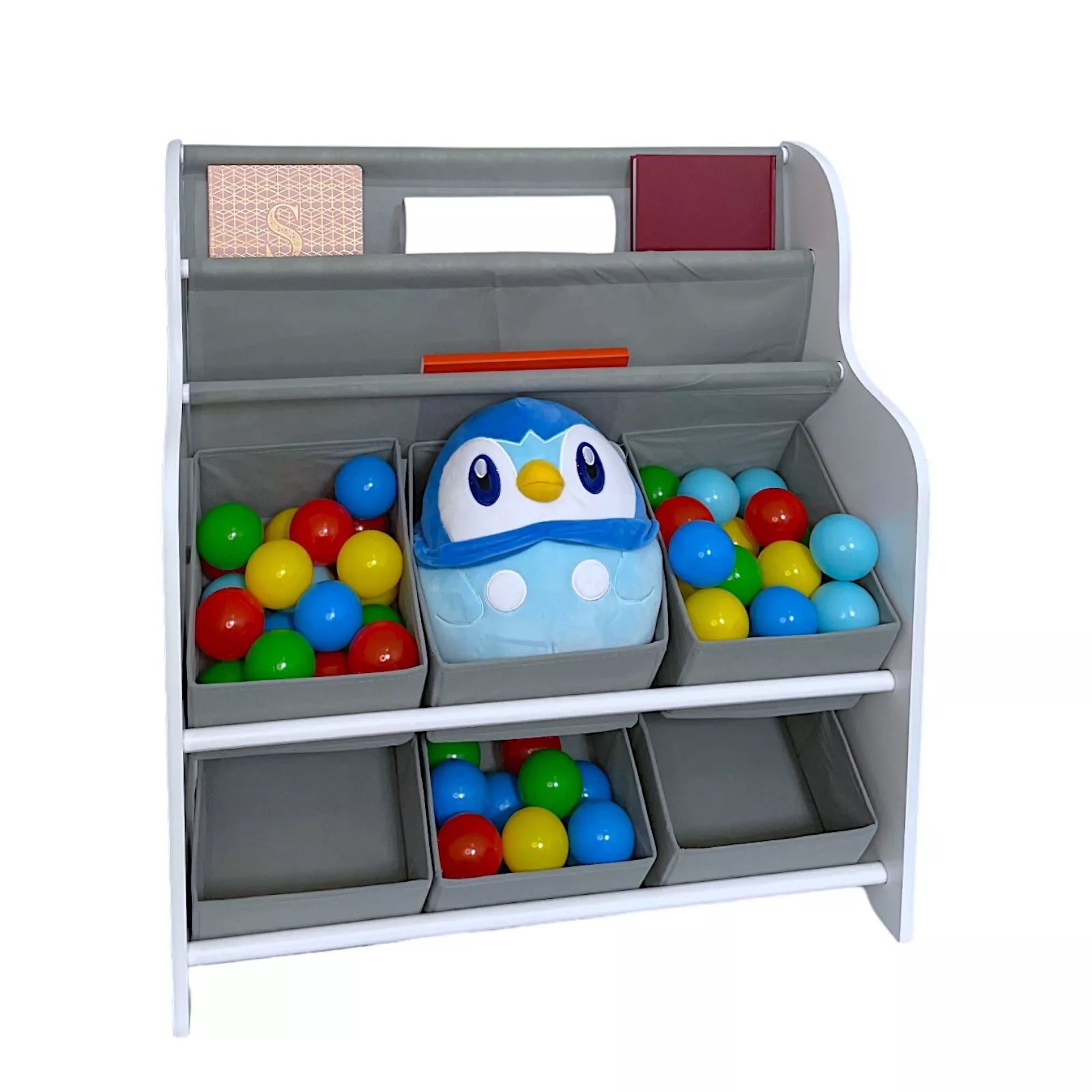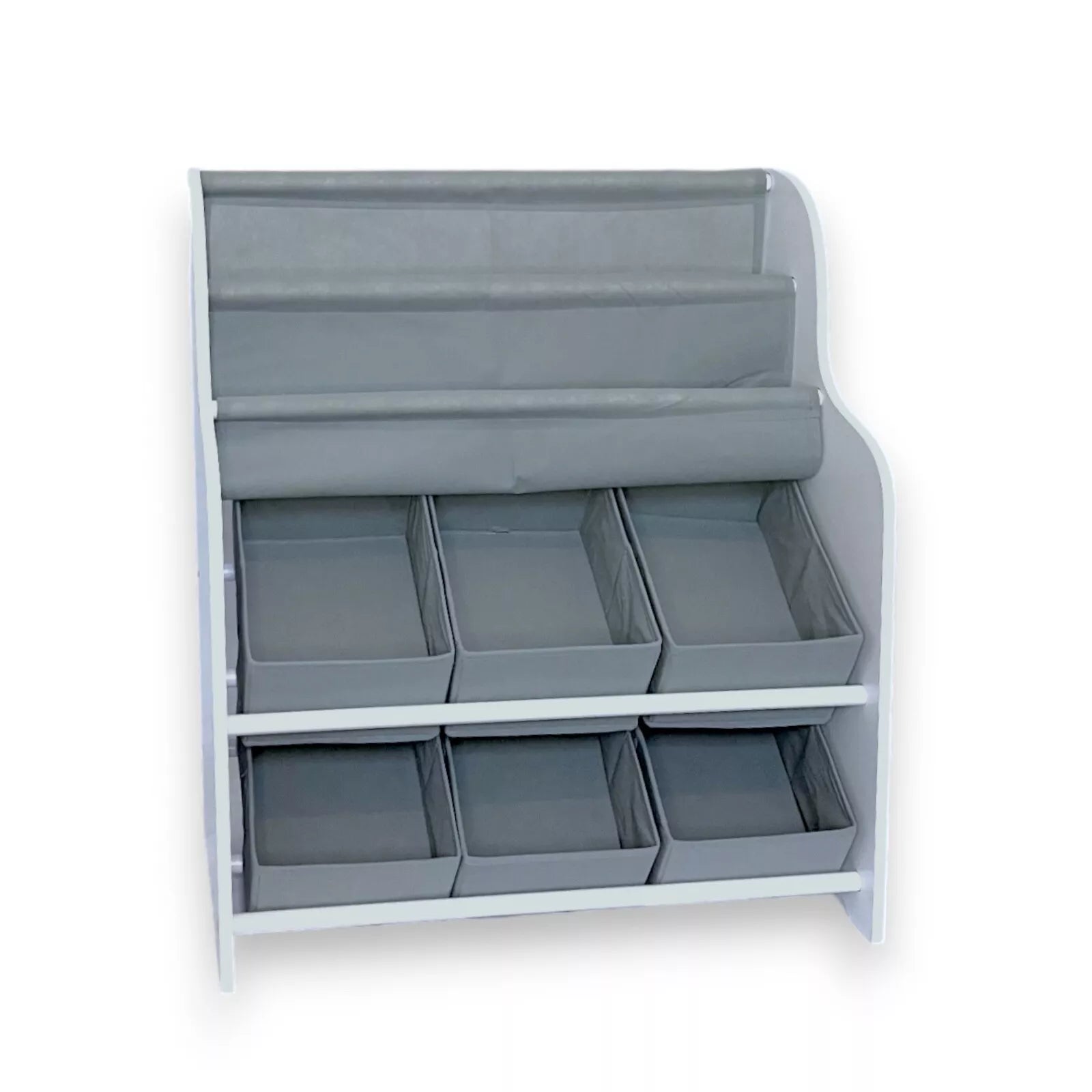 Keep your child’s room organised and clutter-free with the *Mobel Storage with Bookshelves*. This practical storage solution features six canvas bins ideal for sorting toys, clothes, or other small items, alongside built-in bookshelves to neatly display your child’s favourite books. Its sturdy wooden frame provides stability and durability, while the combination of white and grey colours blends effortlessly with most décor styles.