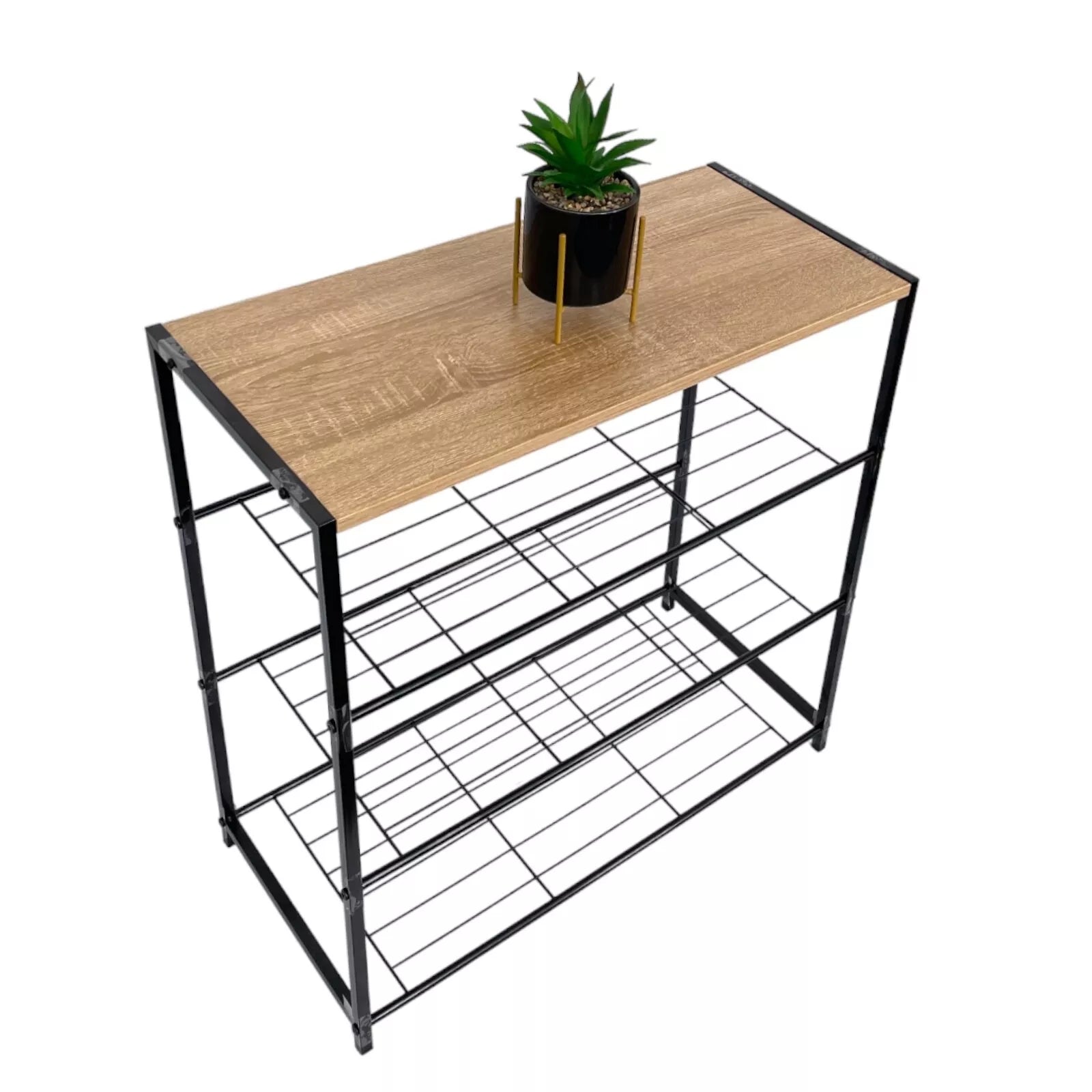 Say goodbye to messy hallways and cluttered bedrooms with this practical and stylish 4 Tier Shoe Rack. With its black metal frame and oak-effect top, it not only helps keep your home tidy but also adds a contemporary touch to any space. Perfect for storing between 6 to 10 pairs of shoes, the four spacious shelves make it easy to find the perfect pair every time. Lightweight yet sturdy, this unit is easy to move around and fits beautifully into any modern home.