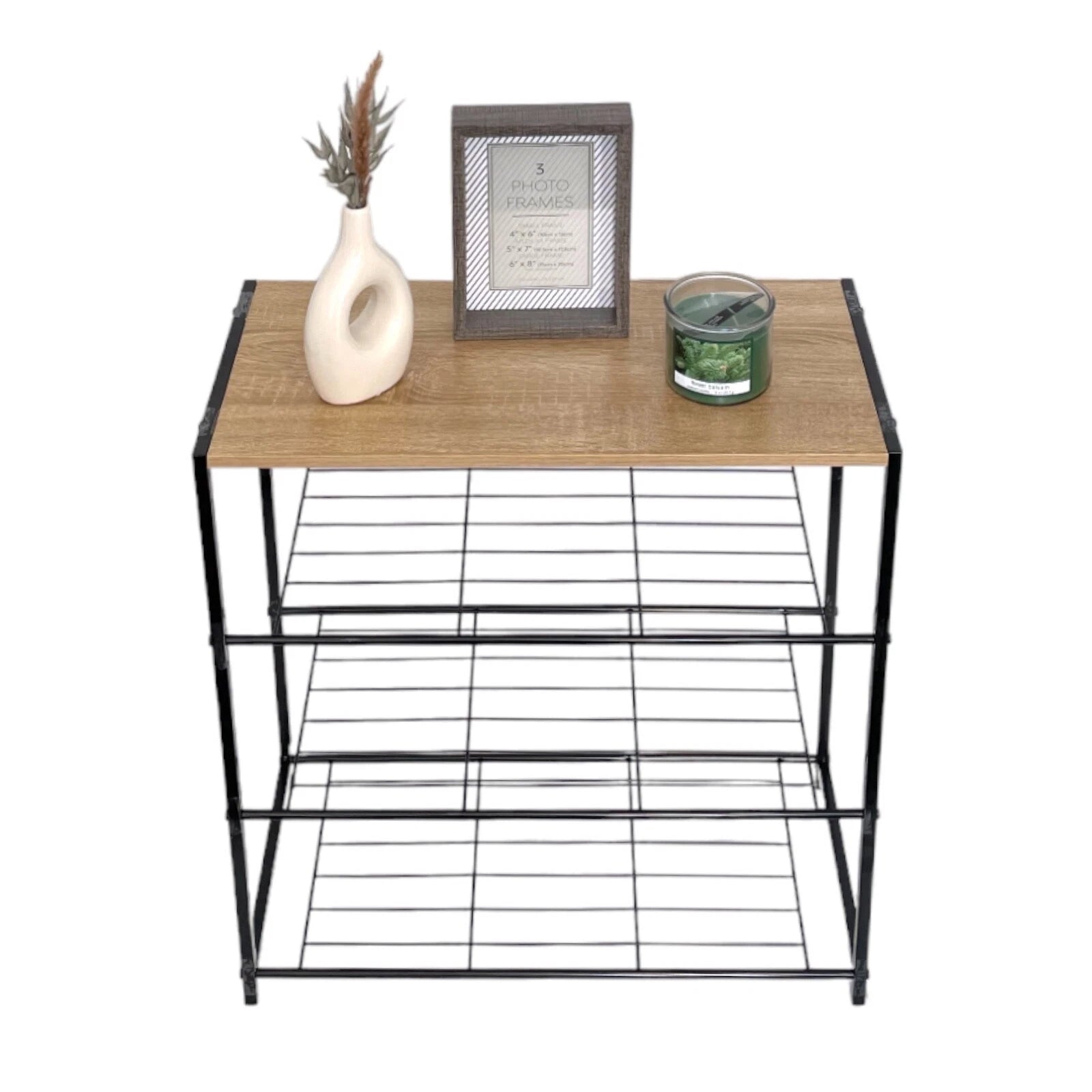Contemporary 4 Tier Storage Shoes Rack Black Metal Frame Oak Finish Top Home