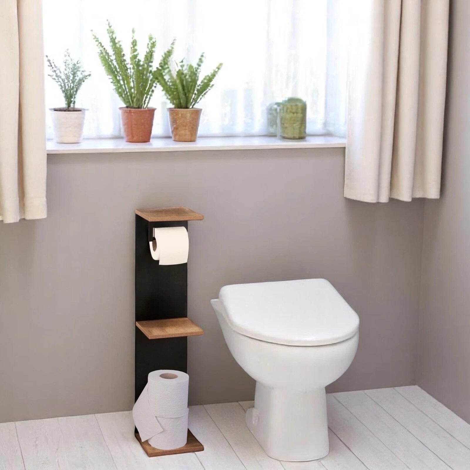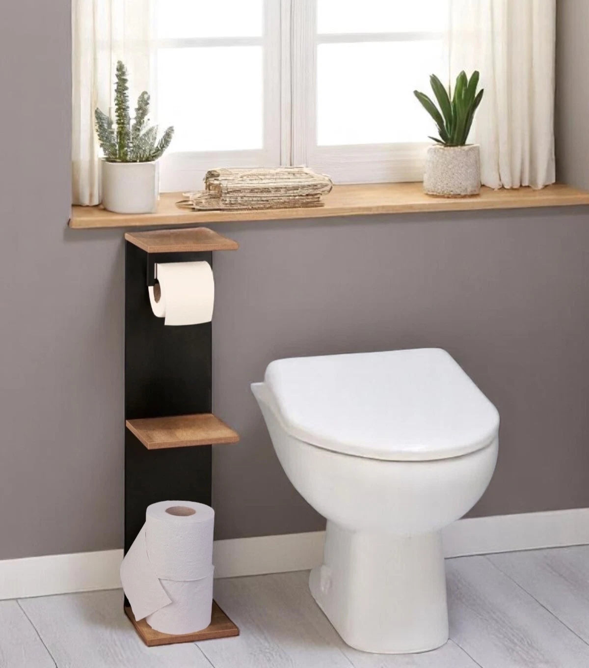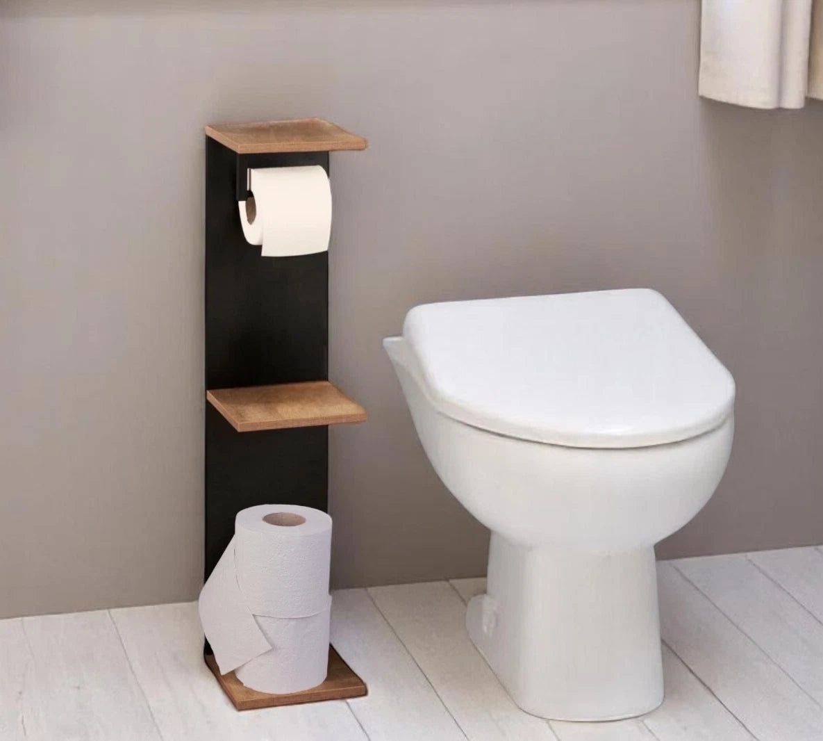 Add a touch of modern elegance to your bathroom with the Homelox Bathroom Shelf with Toilet Paper Roll Holder in a rich dark oak finish. Designed for both style and practicality, this vertical unit offers convenient storage for toiletries, towels, or décor while incorporating a built-in toilet roll holder for added functionality.