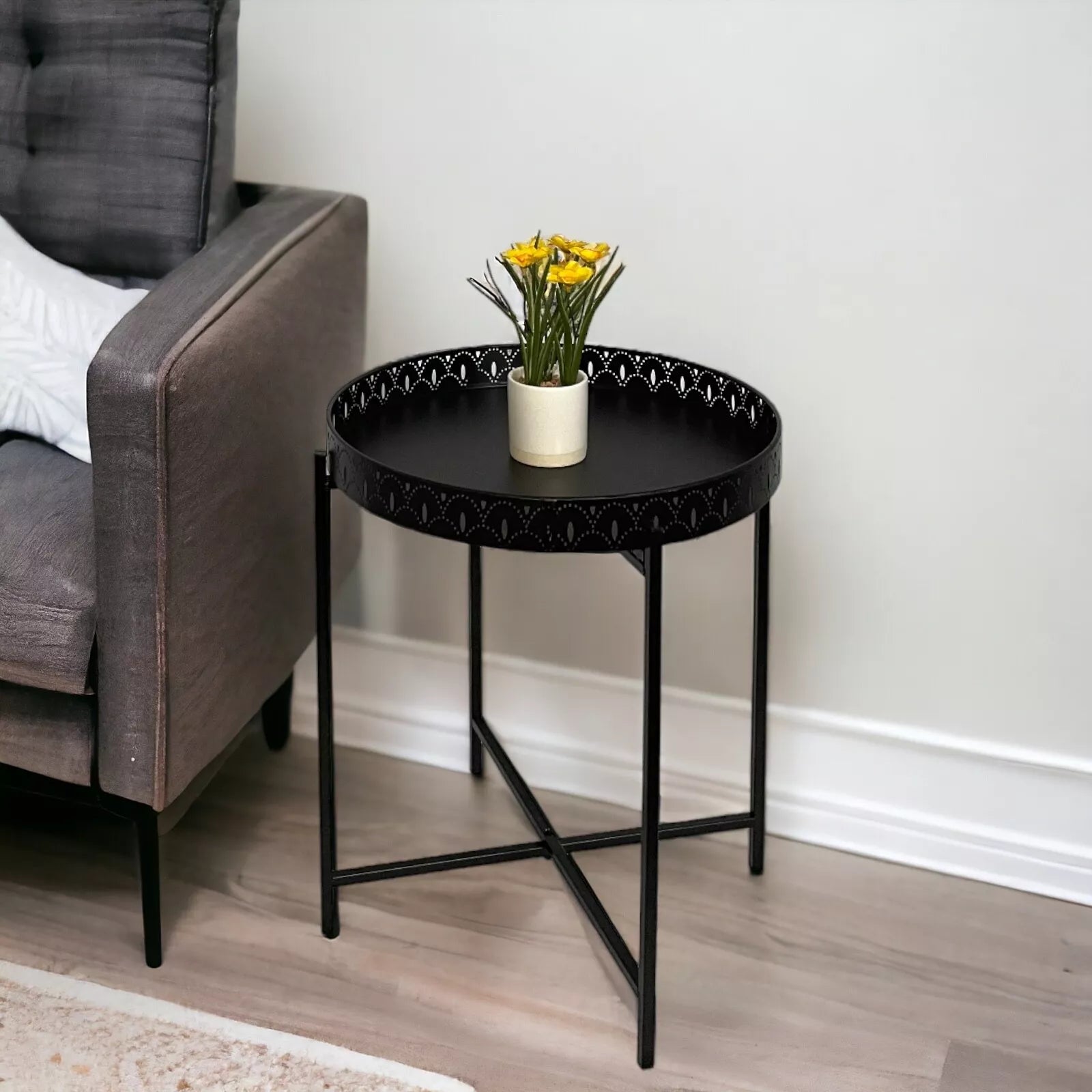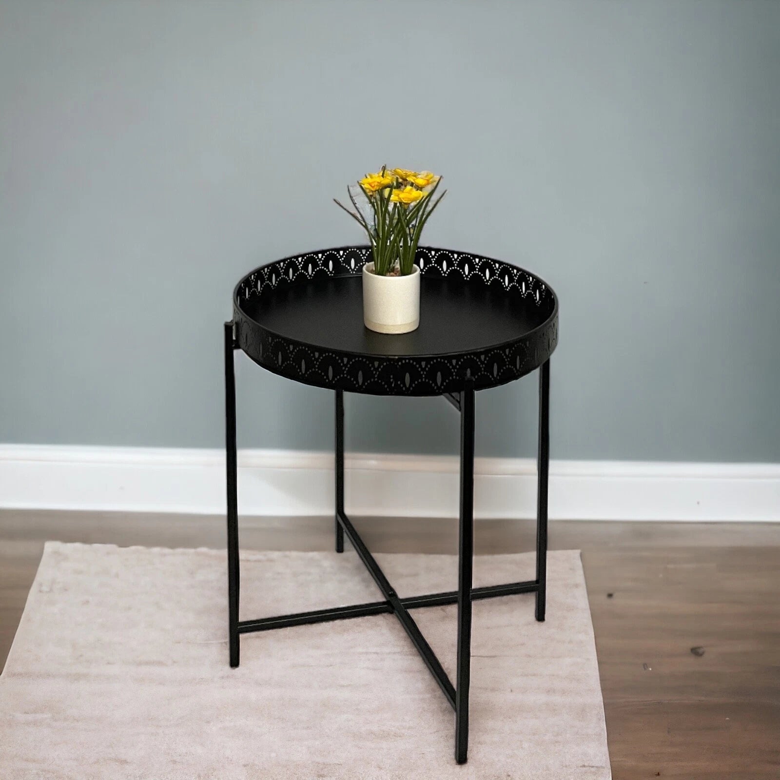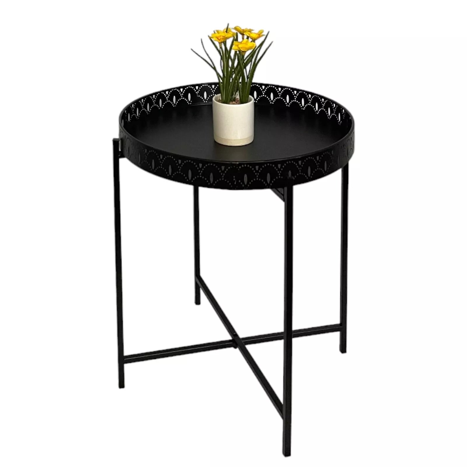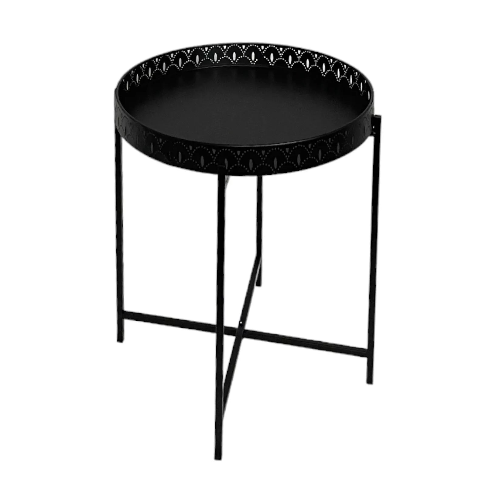Kasbah Black Tray Table – a stylish and versatile addition to your living room furniture collection. This contemporary black metal side coffee table features a removable tray top, making it perfect for serving drinks, snacks, or displaying décor.