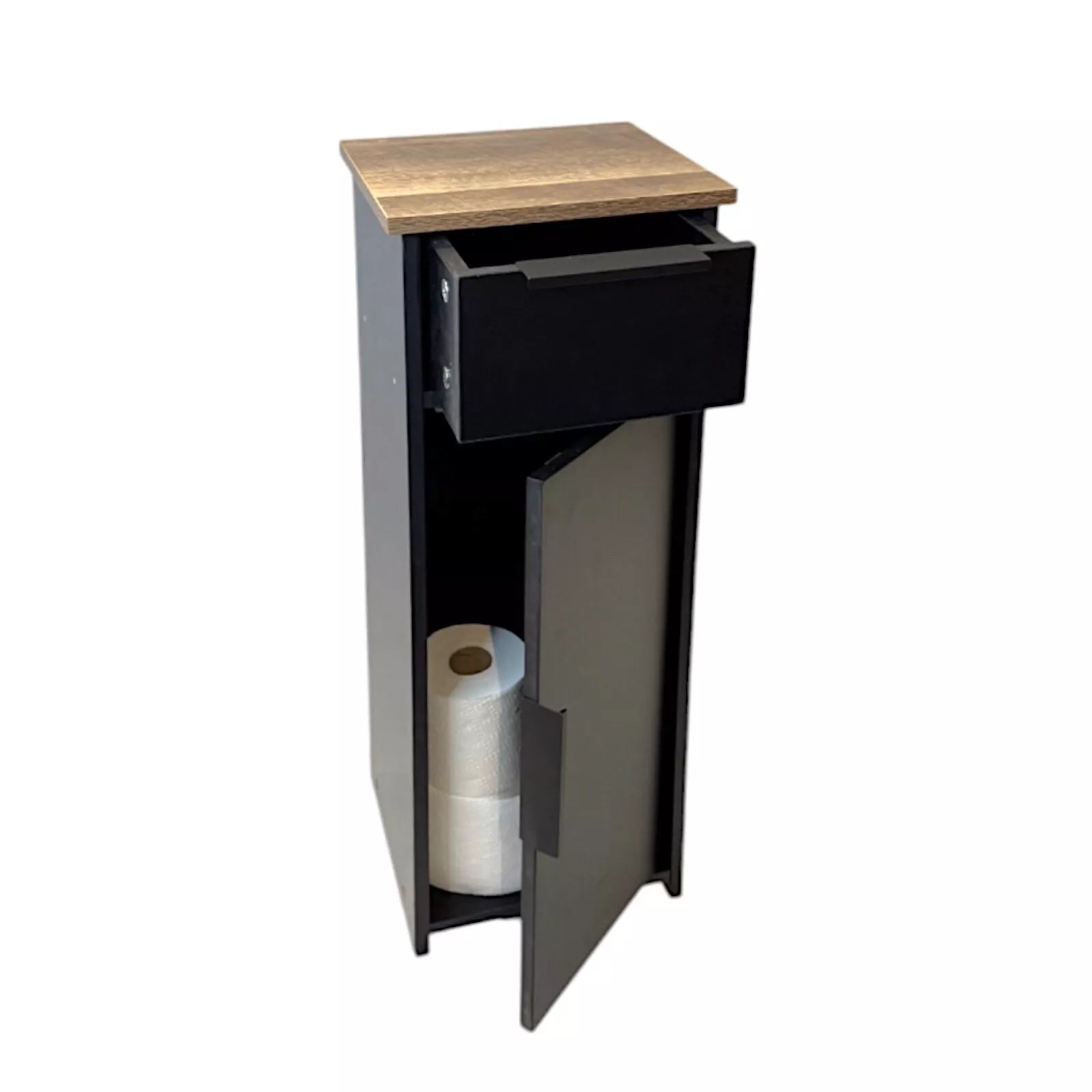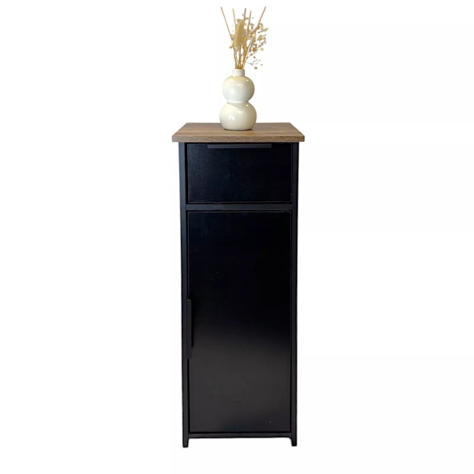 Organise your bathroom in style with this Black Wood Free Standing 1 Drawer Cabinet. Combining modern design with practical storage, this compact unit features one drawer and a lower cabinet, perfect for storing toiletries, towels, and other essentials. The crisp black painted finish and dark oak accents add a touch of elegance to any bathroom setting.