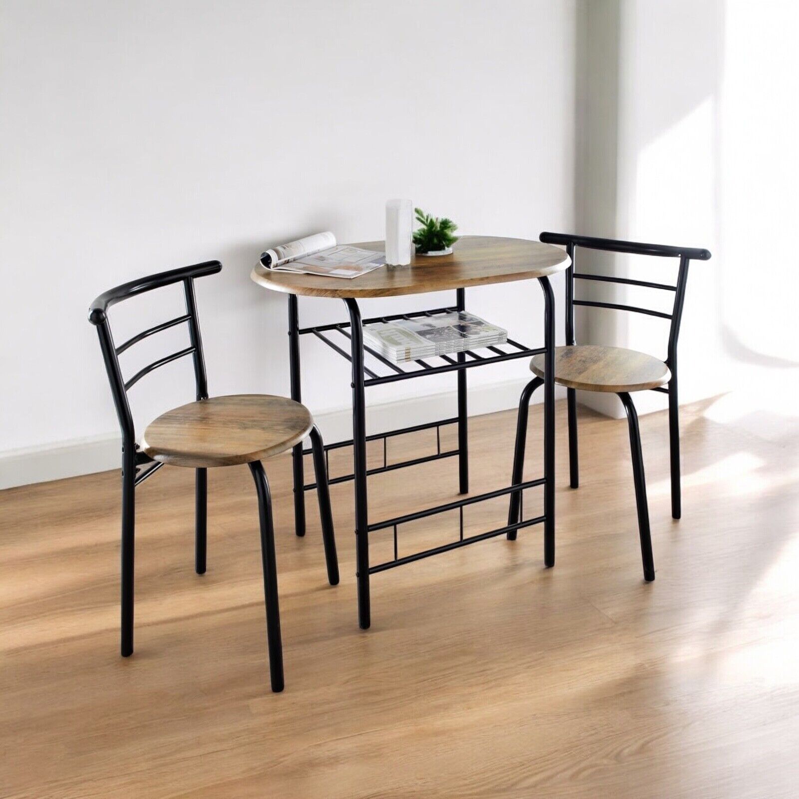 Whether you're sipping your morning coffee with the newspaper or enjoying a full breakfast spread, this sleek table with two comfortable chairs adds both charm and practicality to your kitchen or dining space.