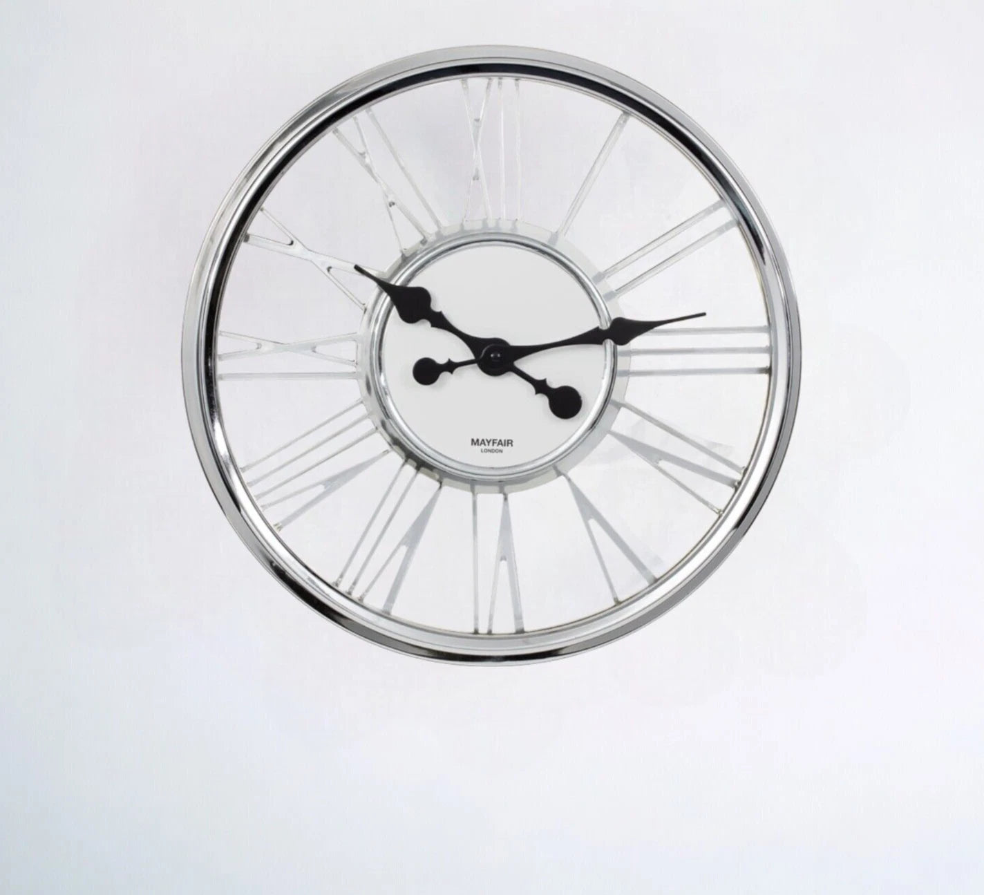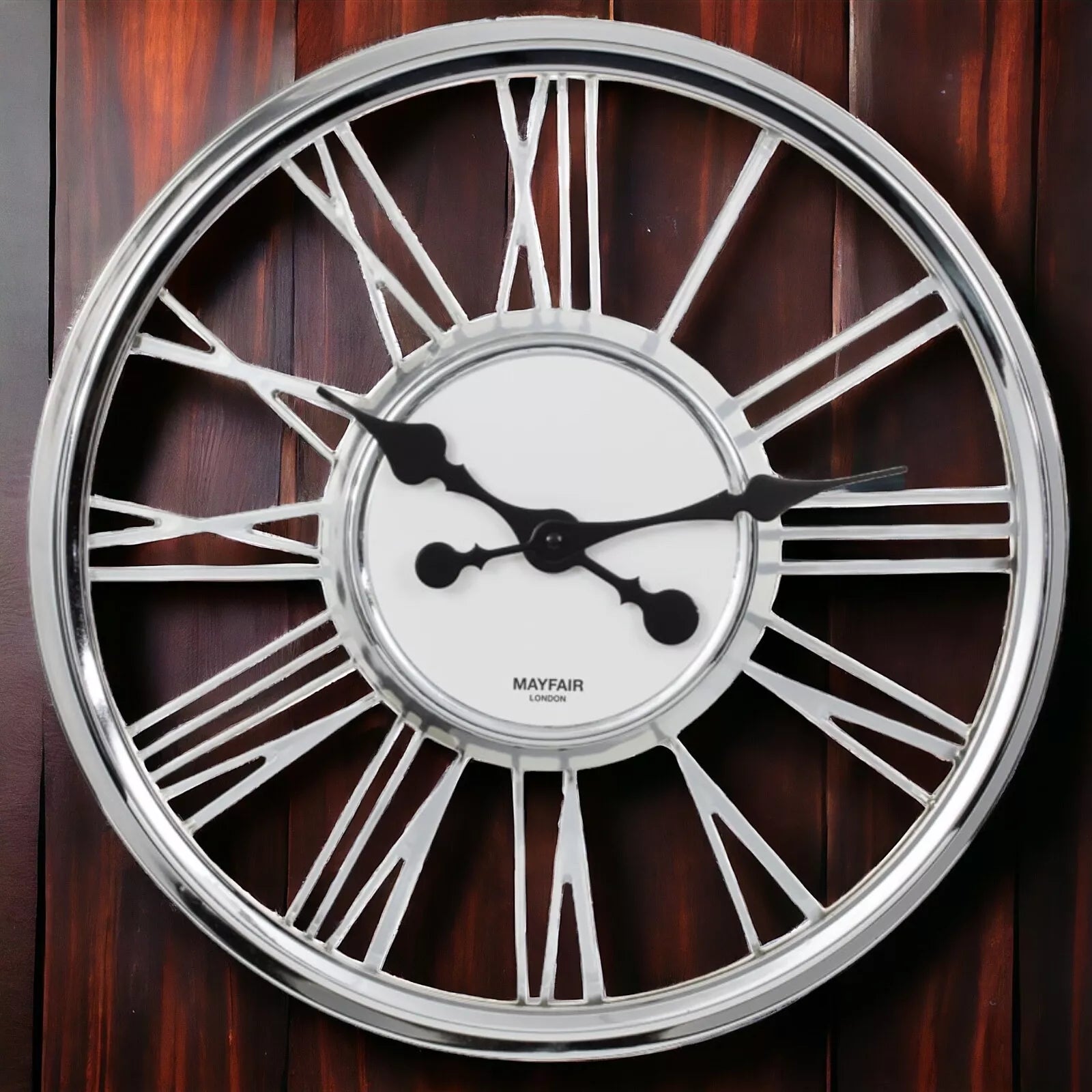 Add the finishing touch to your home with this large Modern Chrome Mayfair & Co Roman Numeral Wall Clock. Featuring classic Roman numerals on its face, this elegant clock combines timeless style with modern design, making it a convenient and stylish addition to any room in your house.