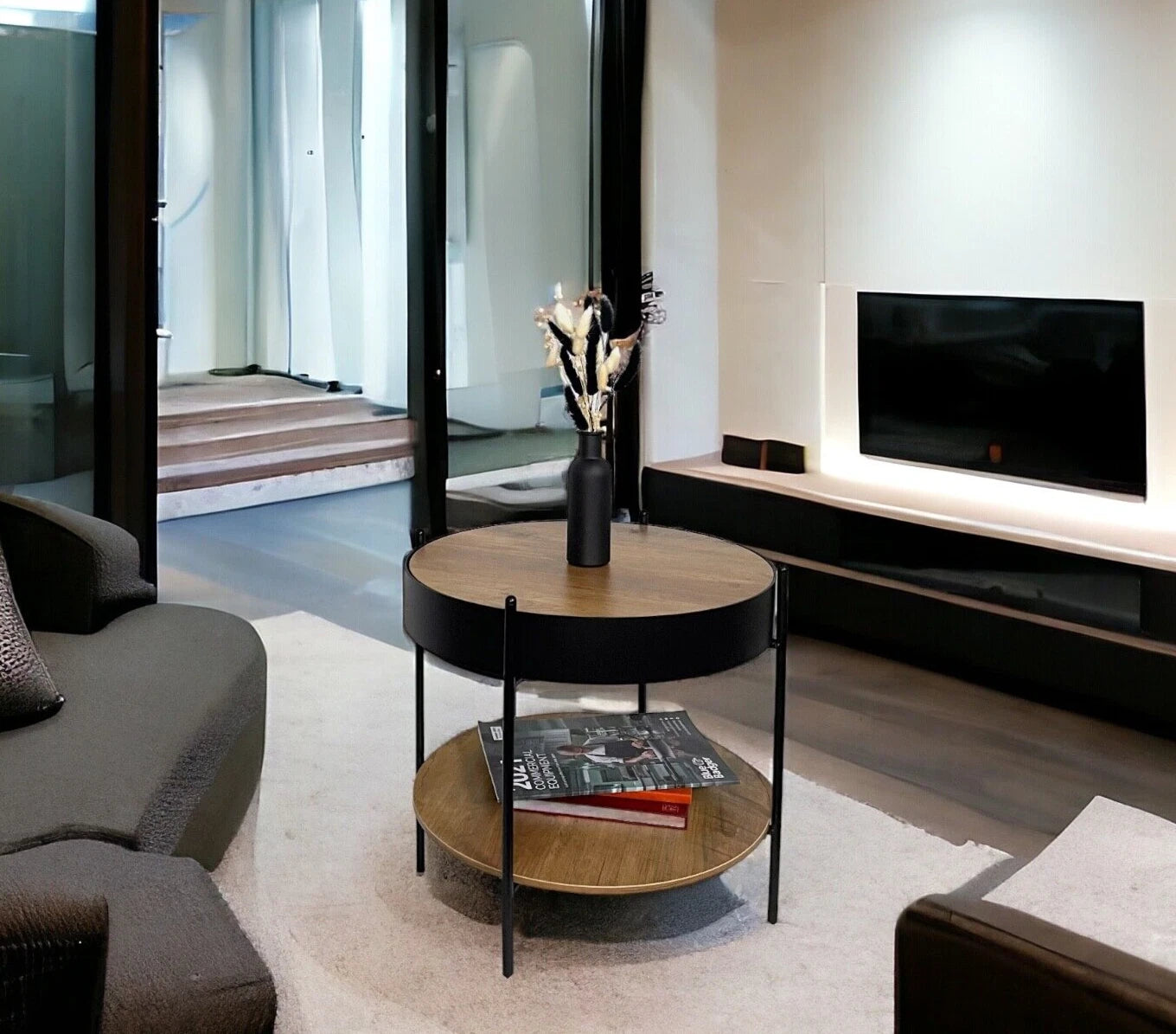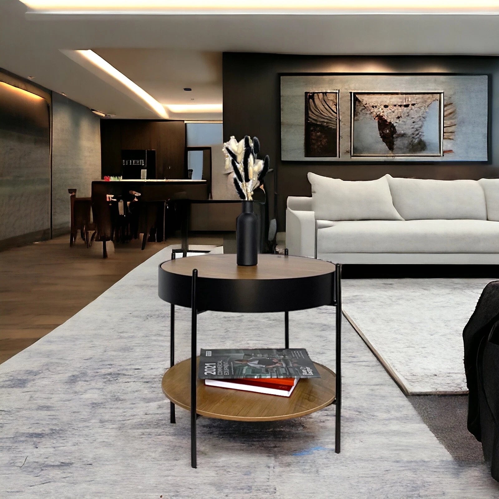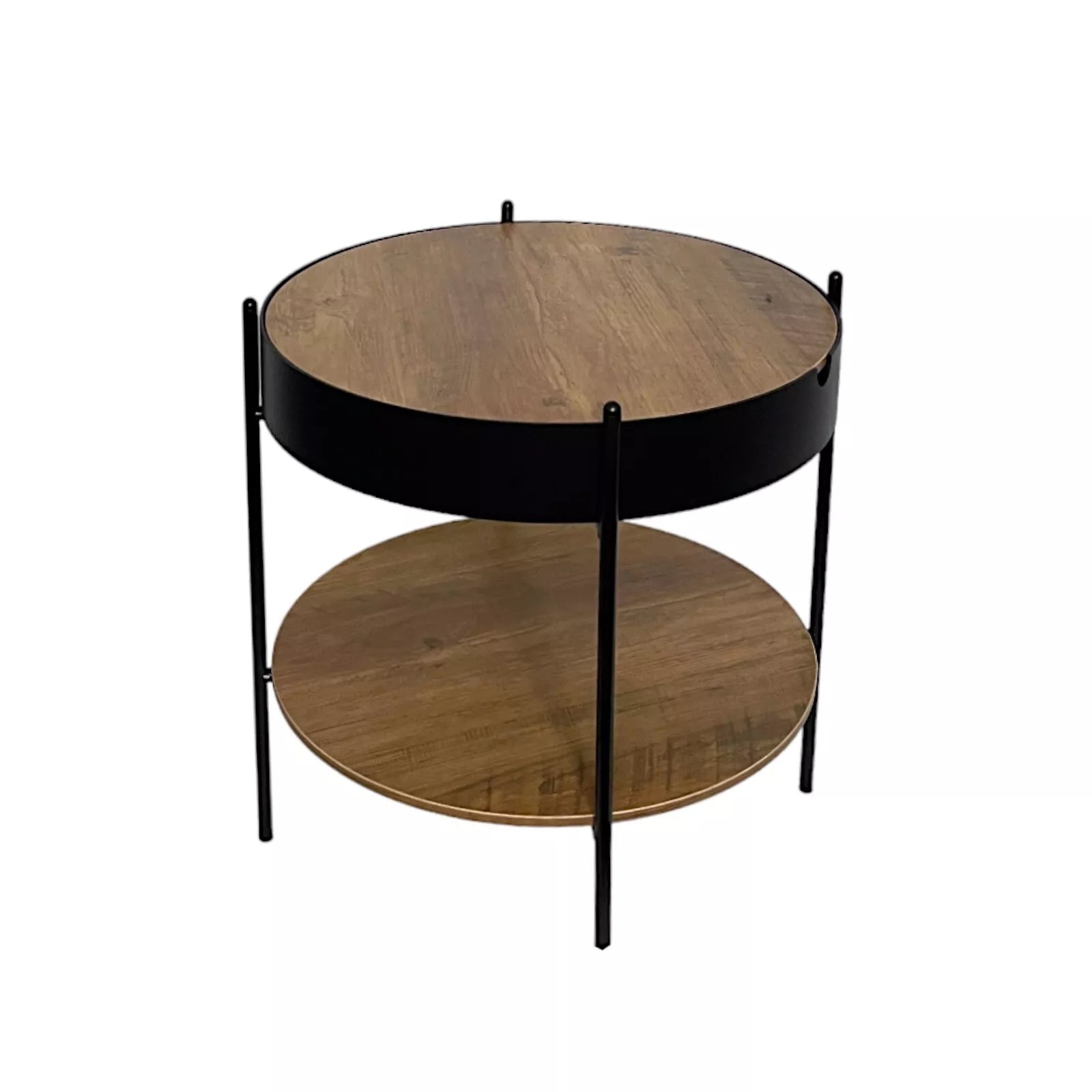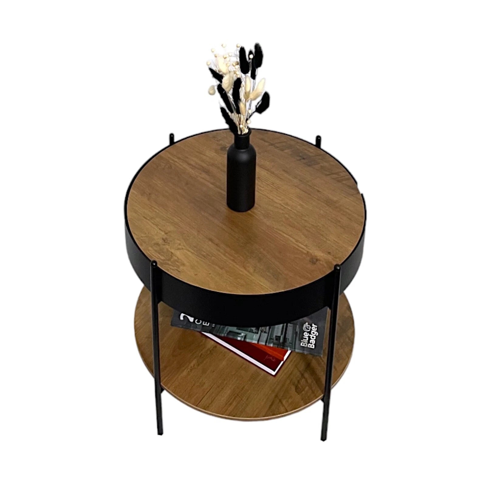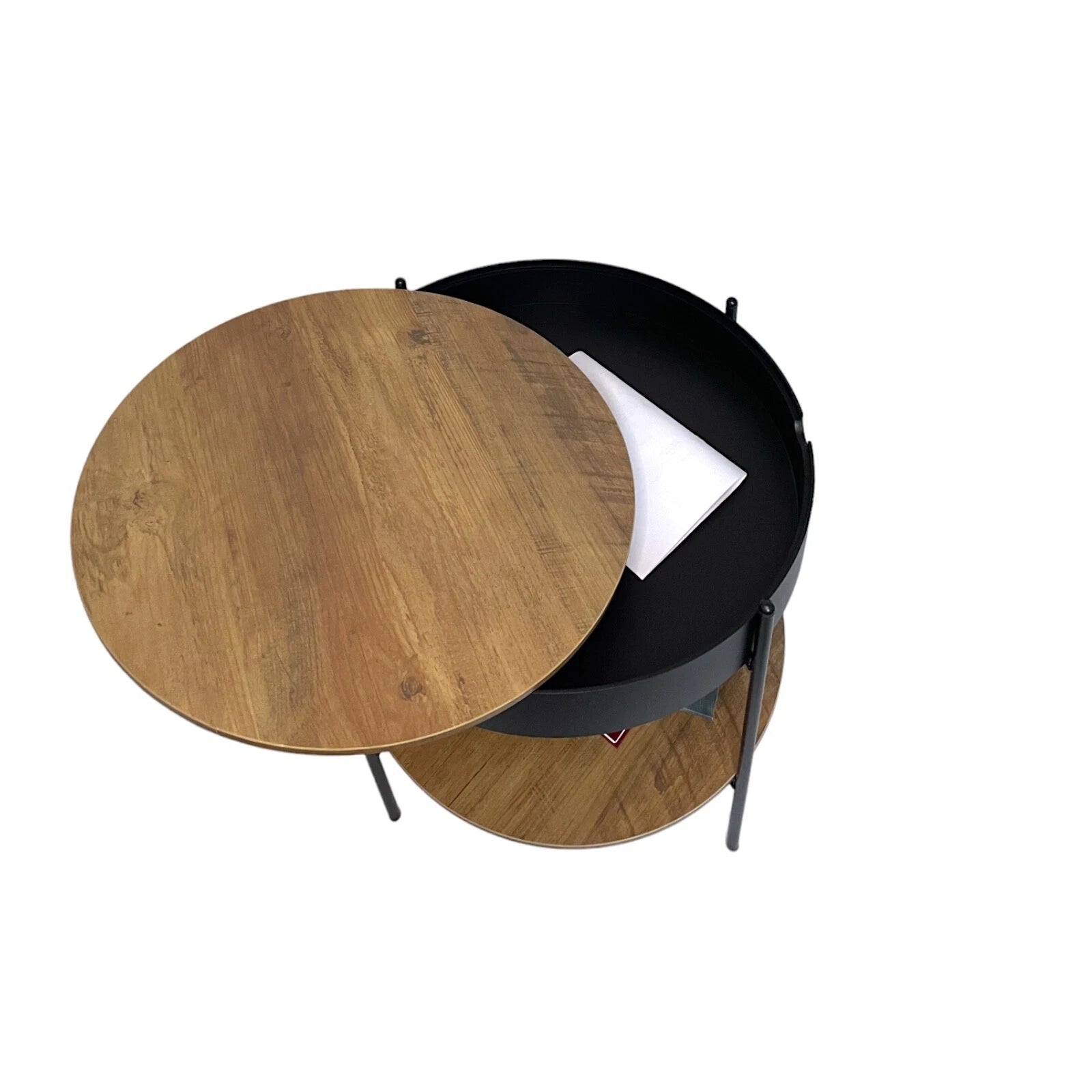 This round coffee table features a rustic oak finish that pairs beautifully with the sturdy metal frame, creating a modern yet warm look. Its removable table top allows for hidden storage underneath, making it a versatile addition to your home. Perfect for storing books, remotes, or other small items, this table is both practical and chic.