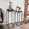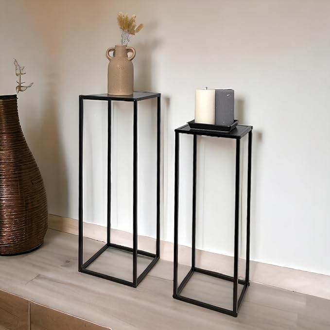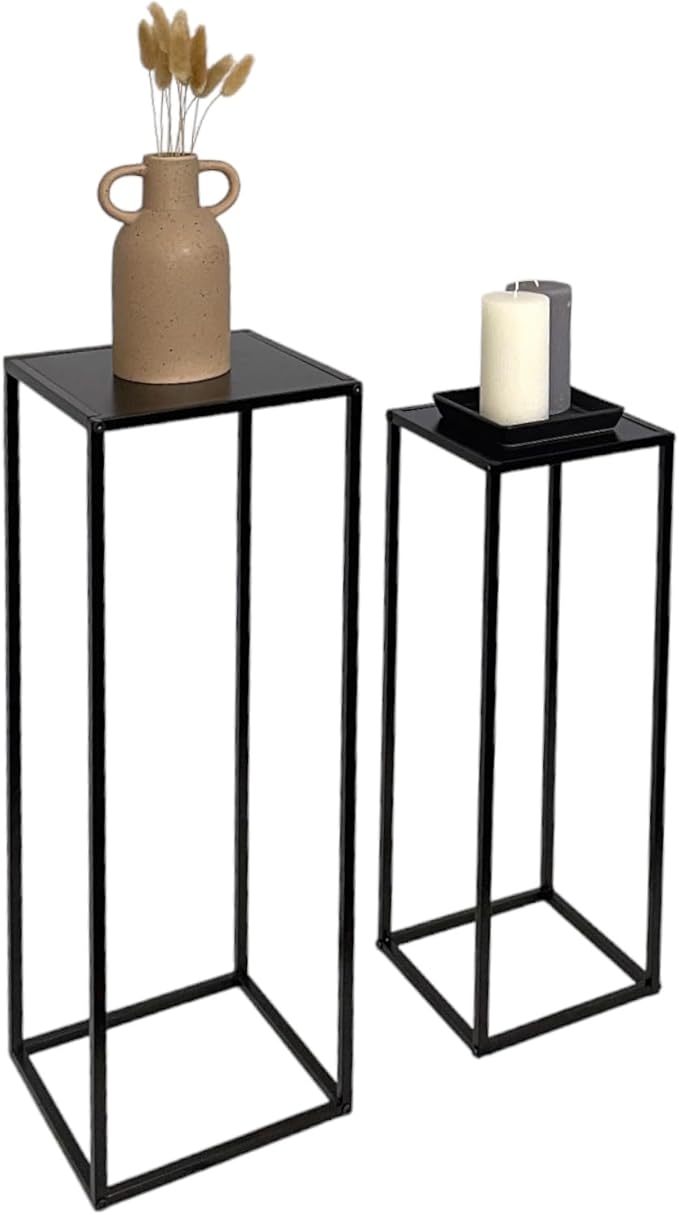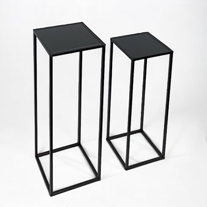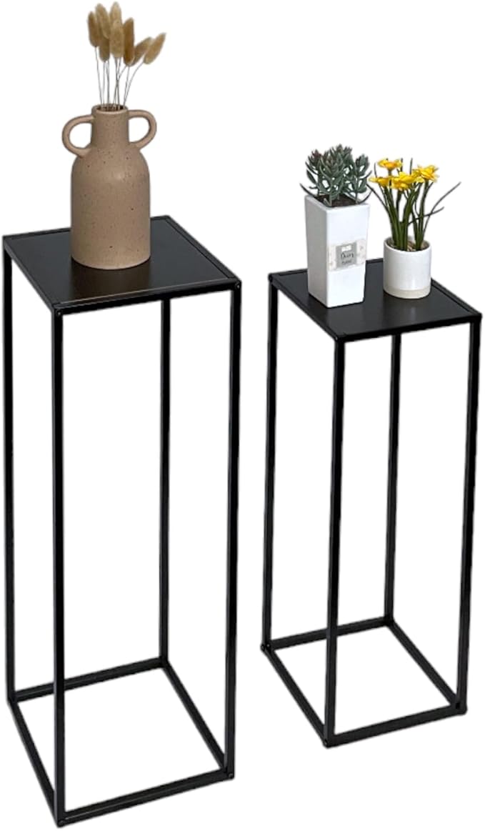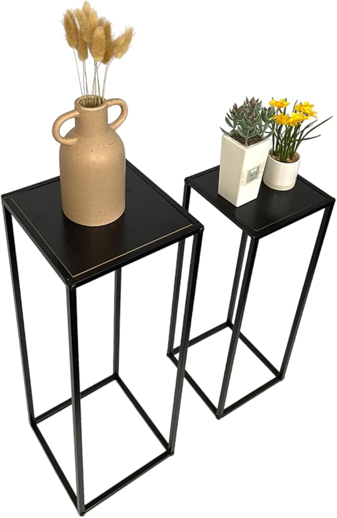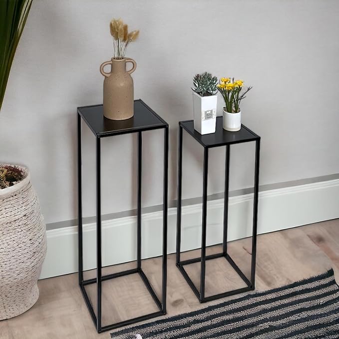 Add a touch of modern elegance to your home with this set of 2 Side Plant Tables, perfect for showcasing your favorite indoor plants and decor. With a sleek black metal frame and sturdy MDF table tops, these tables offer both style and durability. Whether placed in your hallway, living room, or any space in need of an accent piece, these tables provide a functional and decorative solution. The set includes two sizes, allowing you to create a dynamic display while complementing your home's aesthetic. Ideal for adding a minimalist yet sophisticated flair to any room.