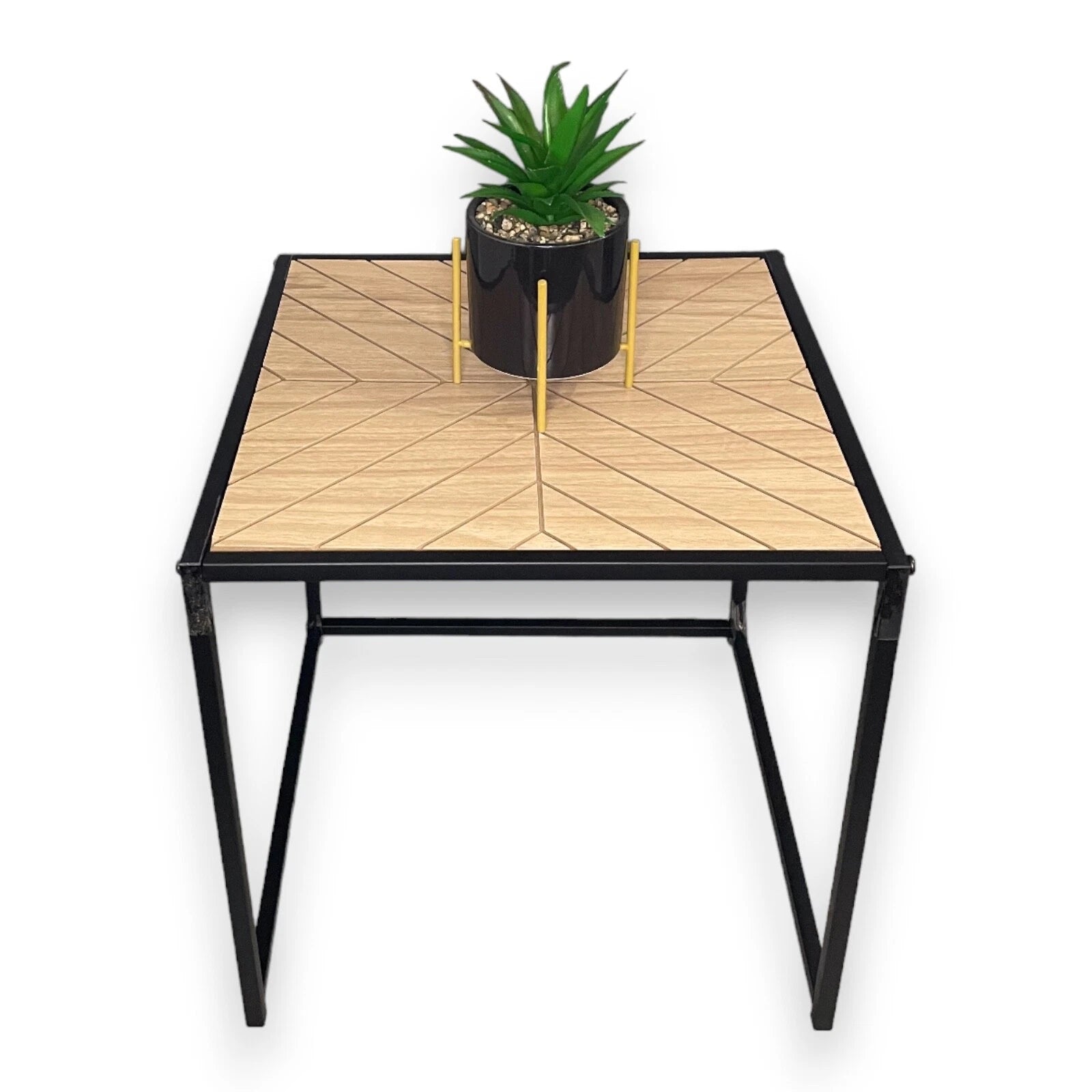 Add dimension and a touch of modern style to your living space with the *Home Essentials Herringbone Table*. Featuring a natural wood-effect top and sleek black metal legs, this compact and versatile table is perfect as a side table, plant stand, or accent piece in any room. Its minimalist design blends easily with various interior styles, making it a practical yet stylish addition to your home.