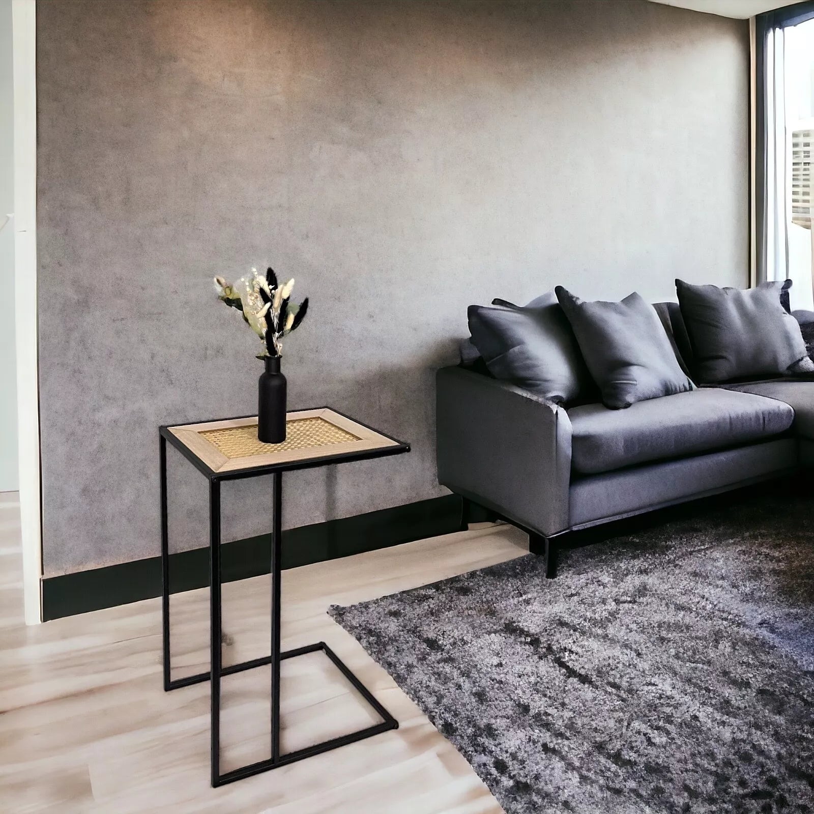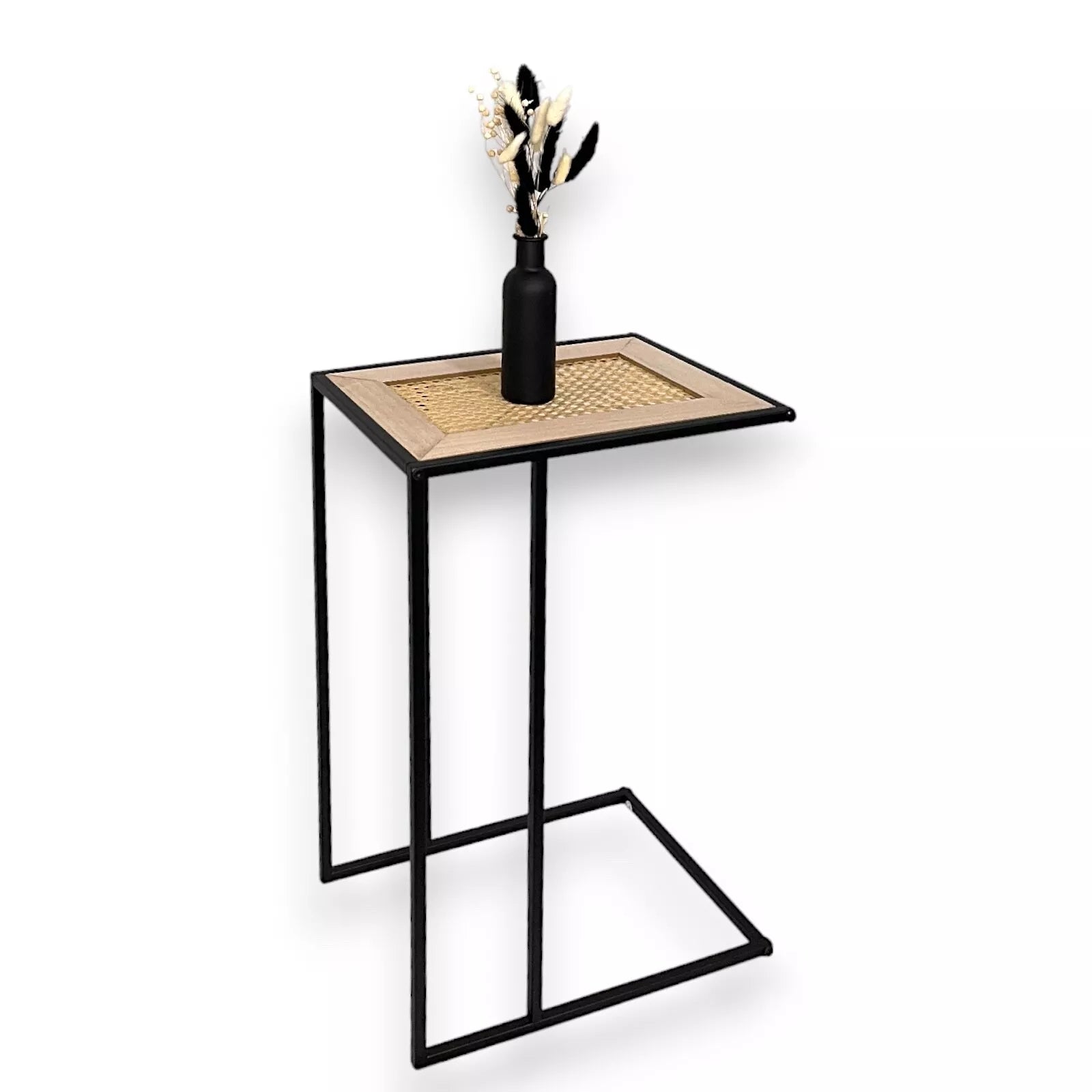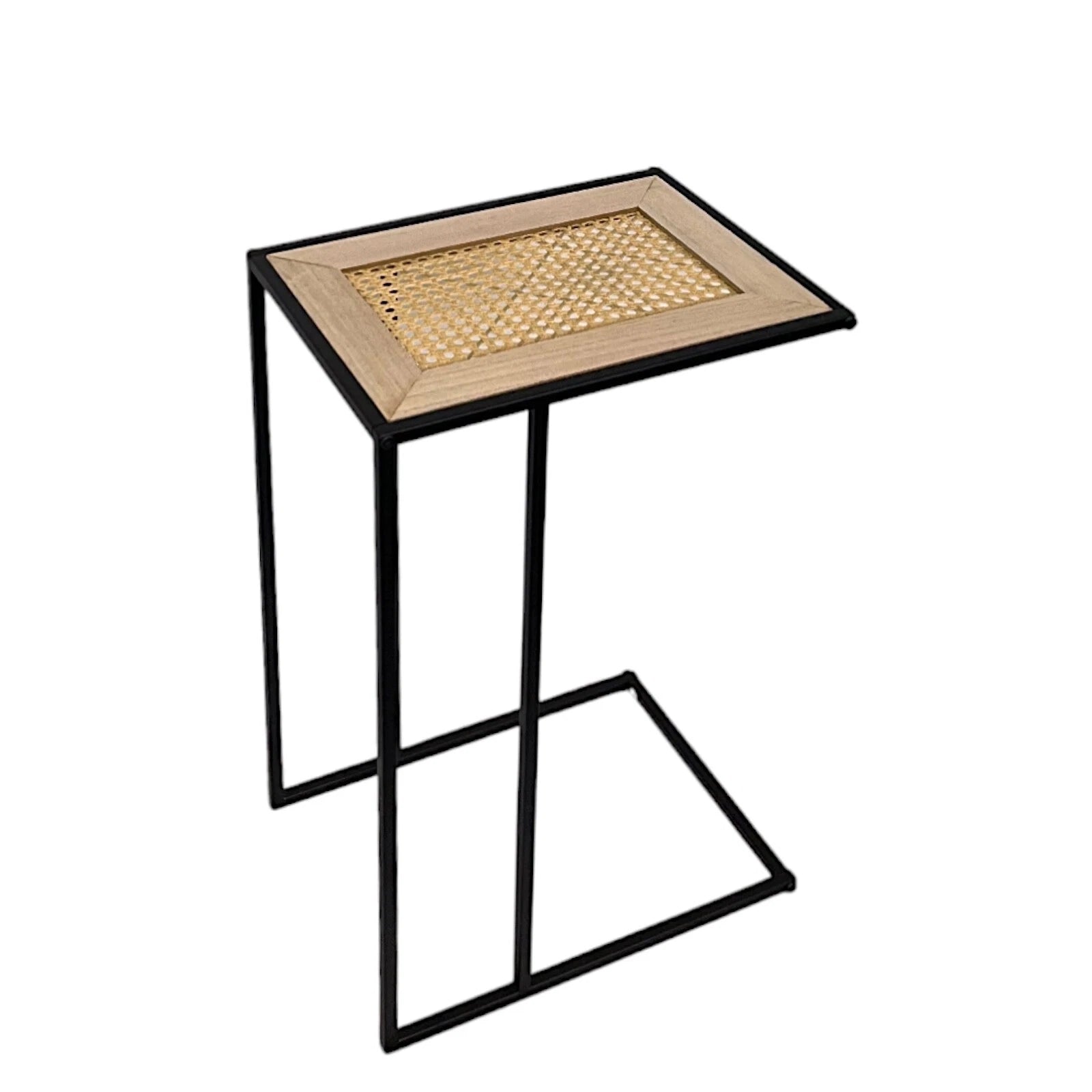 Featuring a woven cane-effect top and sturdy black metal legs, it offers the perfect spot for resting drinks, snacks, or décor.