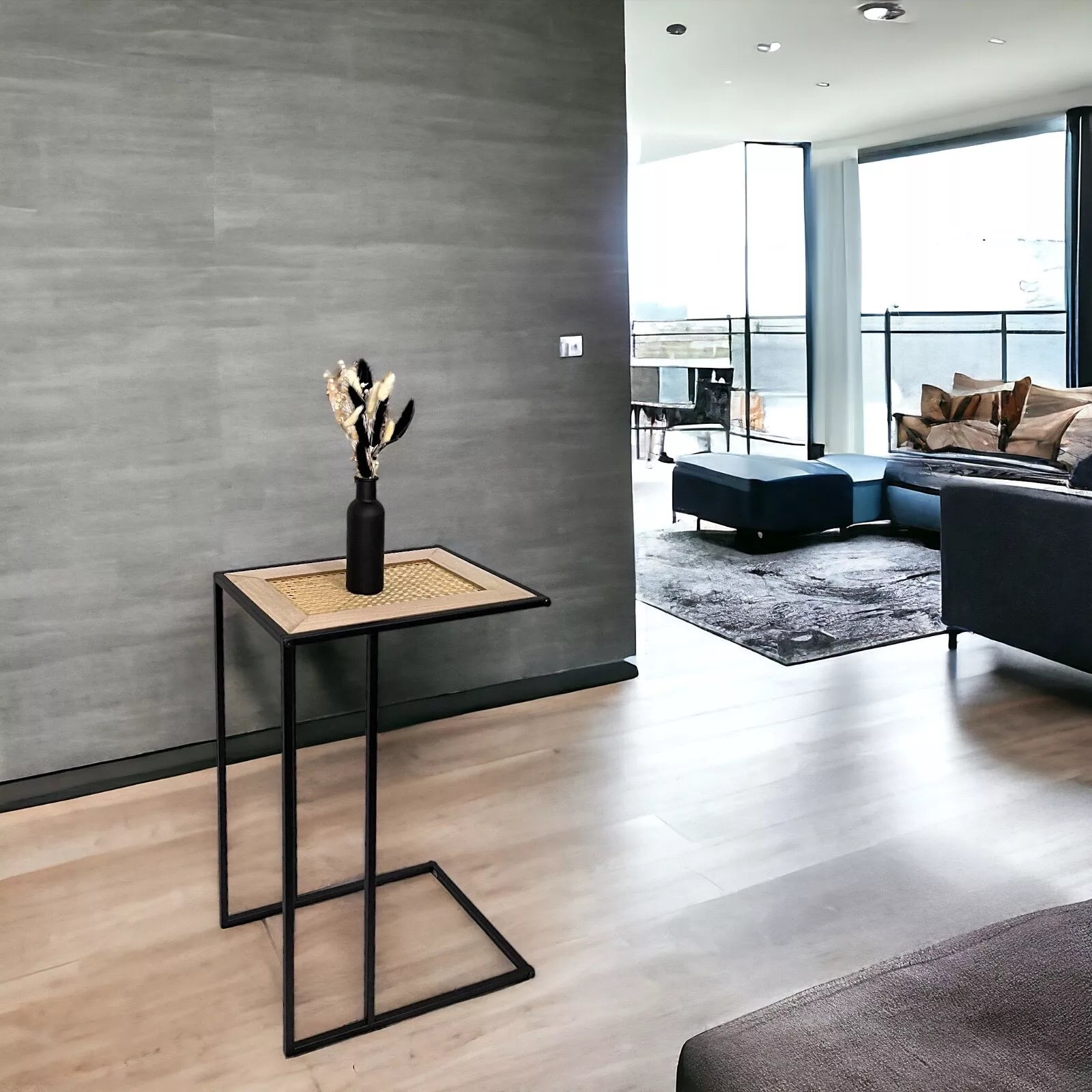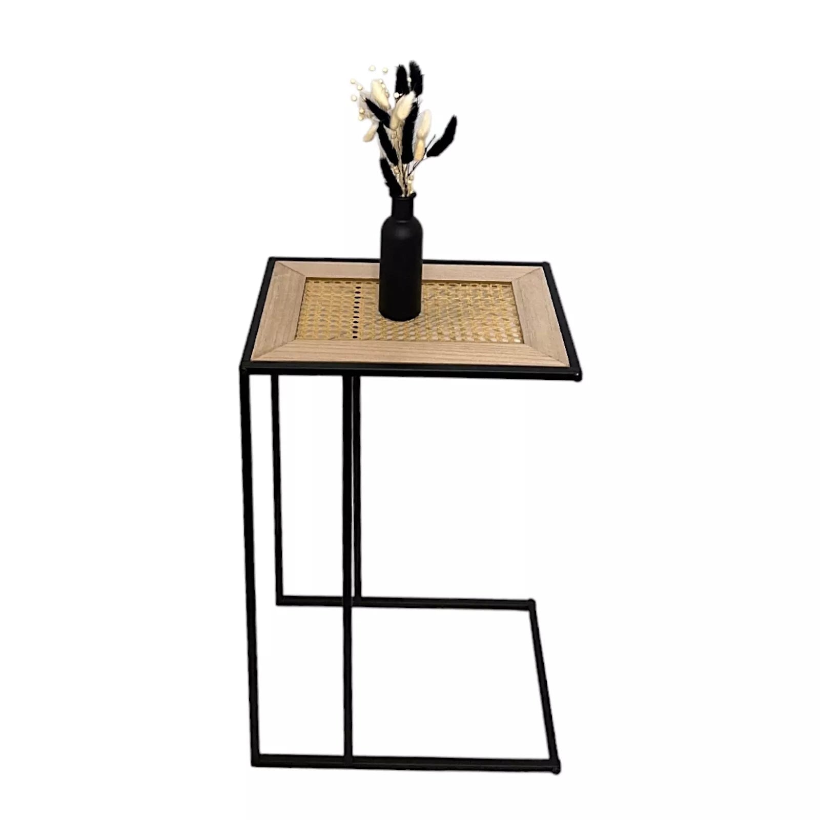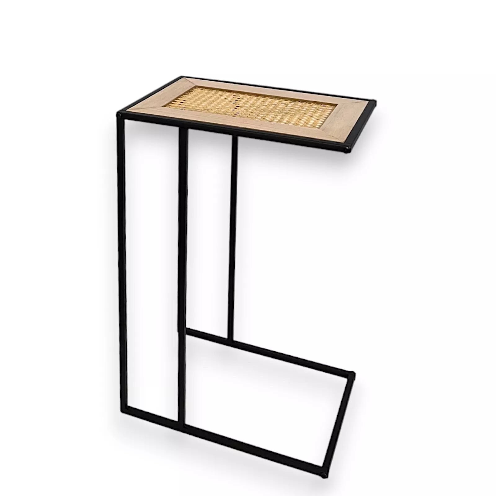 Featuring a woven cane-effect top and sturdy black metal legs, it offers the perfect spot for resting drinks, snacks, or décor.